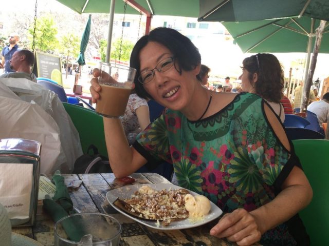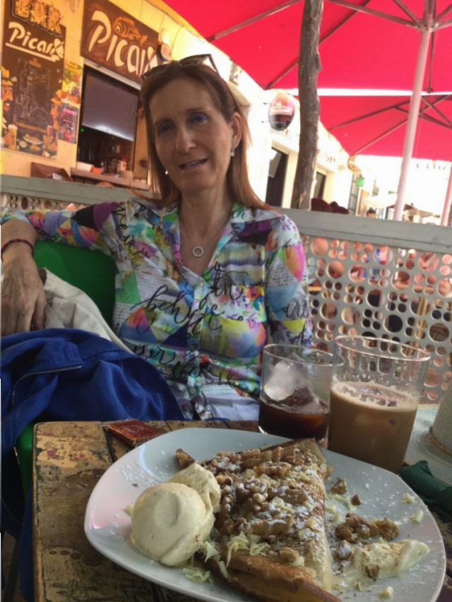 私たちはよく、午後のお茶や食後のコーヒー、夕暮れのビールなどに、ふらりと訪れます。この日は、友人のカルメンと食後のコーヒー。