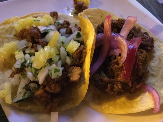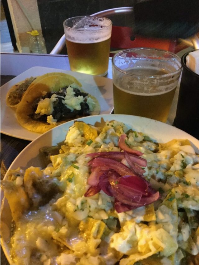 その理由がこちら!写真一枚目をご覧ください。ビールの横においてある「タコス」。これが、ビールを頼むたびについてくる。らしい。それも無料で。