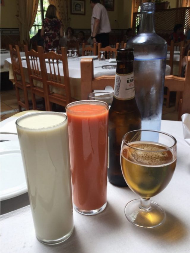 でも、ドリンクみたいに飲んで食します。白いのは「アホ・ブランコ」、オレンジのは「ガスパッチョ」。夏の冷たいスープといえば、これに決まり!