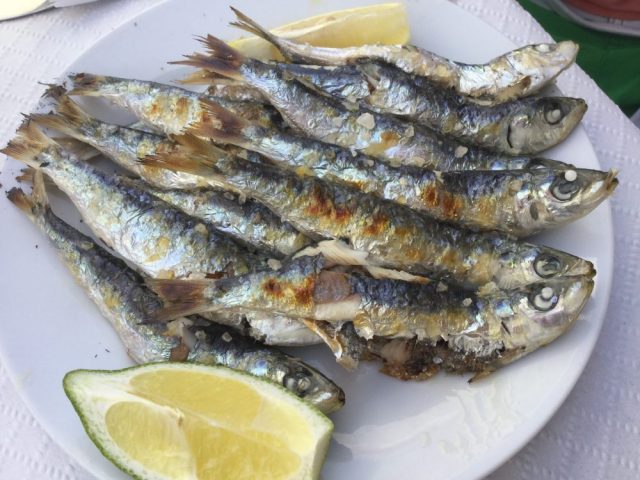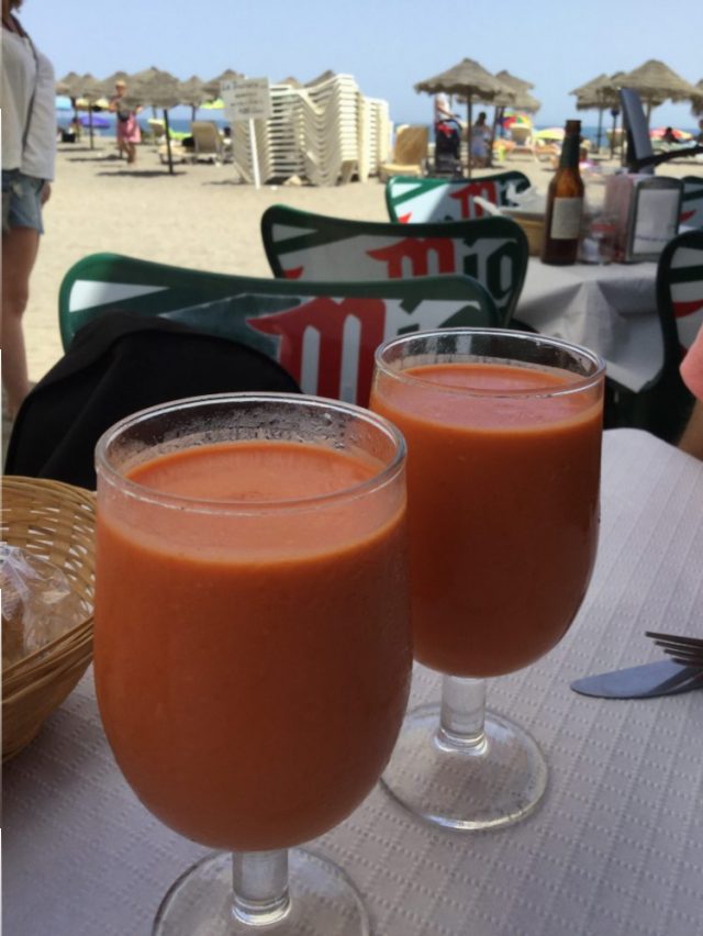 さて、パエジャを待つ間、まずは「ガスパッチョ」(写真四枚目)と「イワシの塩焼き」(六枚目)を注文。そしてビールで乾杯。サルー!海の風が気持ちいい~。