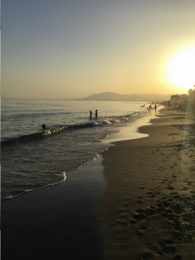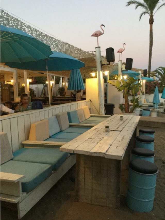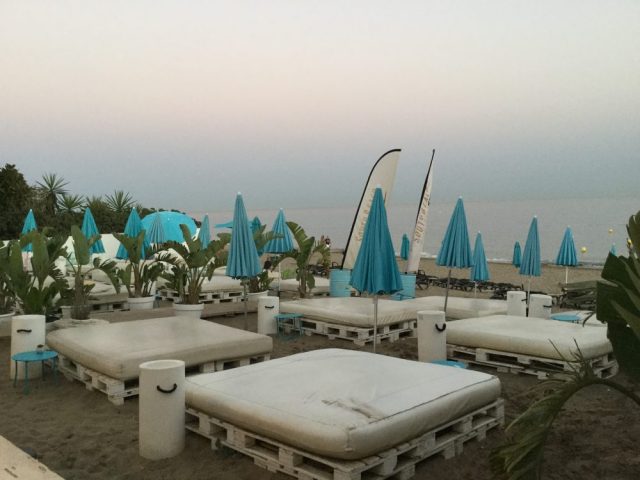 三枚目が、午後八時半。陽が沈みかけてます。ここで、ビーチを後にして、近くのバルへ。おぉお、すてきだ。「ビーチマット&パラソル」を一日借りてのんびり過ごすなんていかがでしょう(4枚目)。