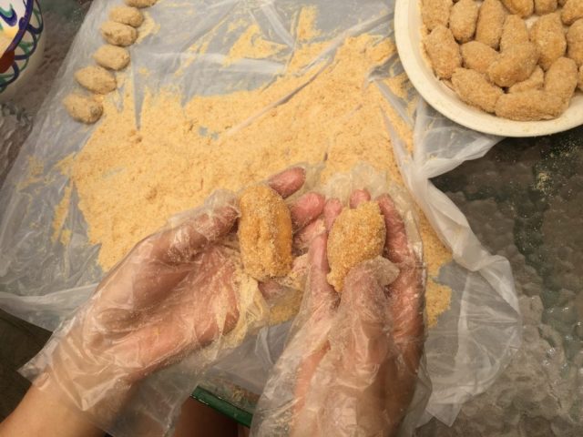 さて、この日は出来上がった具(タネって言うんでしたっけ?日本語が怪しい)をスプーンですくい、パン粉や卵につけて