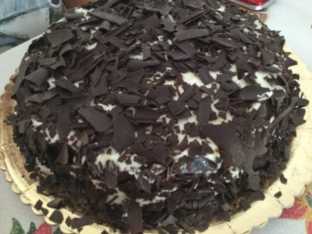 チョコレートケーキ。ティラミス風のケーキ。どちらも大きい。これ12人分くらいあるのでは。誕生日を迎えるイケルがケーキカット。たくさんあるから大変(笑)。みんなに切り分るためずっと立って働いている。