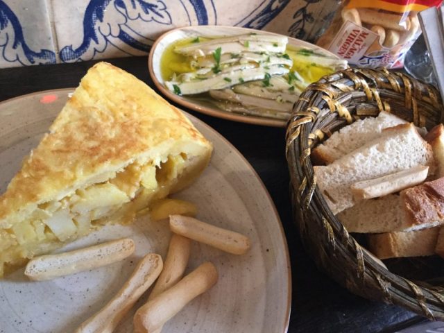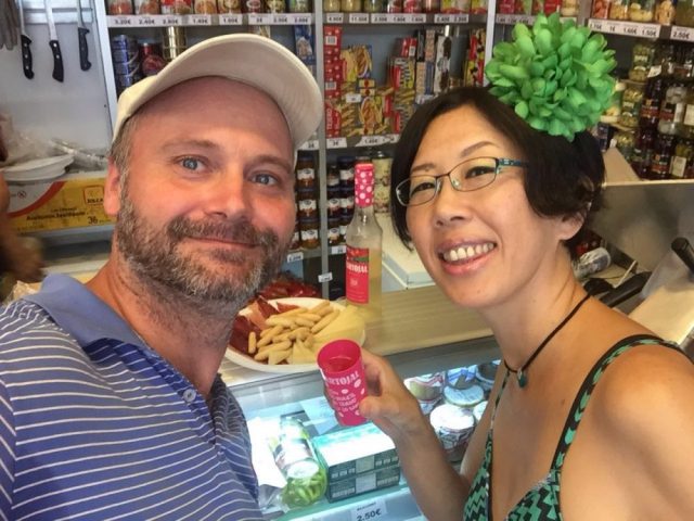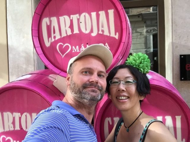 ぶらぶら歩いて、タパス屋へ。タコやスペイン風オムレツで腹ごしらえ(六、七枚目)。その後。フェリアに飲むというワイン「カルトハル」を買いに再び歩き出す。その樽の前でポース(八枚目)。