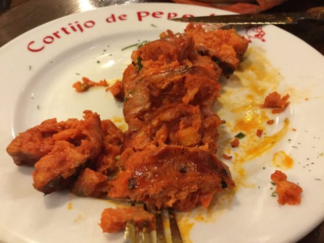 一枚目の写真の料理は「フラメンキン(6ユーロ)」と「ポテトサラダ」。三枚目は「チョリソー(6ユーロ)」。炭火で焼いてくれます。おいし~。
