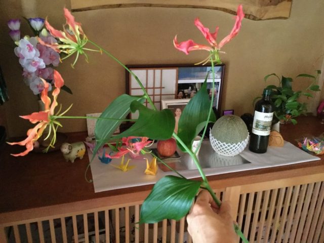 この吹き矢大会の会場は、母とべラのお供えコーナーも兼ねている(五枚目)。せっかくなので花を飾り、二人にもゲームに参加してもらう。