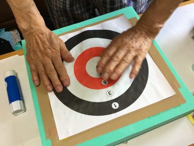 父は毎週「スポーツ吹き矢」に通っている。ので、完全に自動化された動きで、てきぱきと的を貼り、いざゲーム開始(写真一~四枚目)。