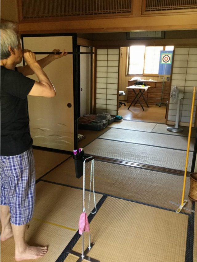 「お父さん、的の後ろが・・・障子なんだけど」