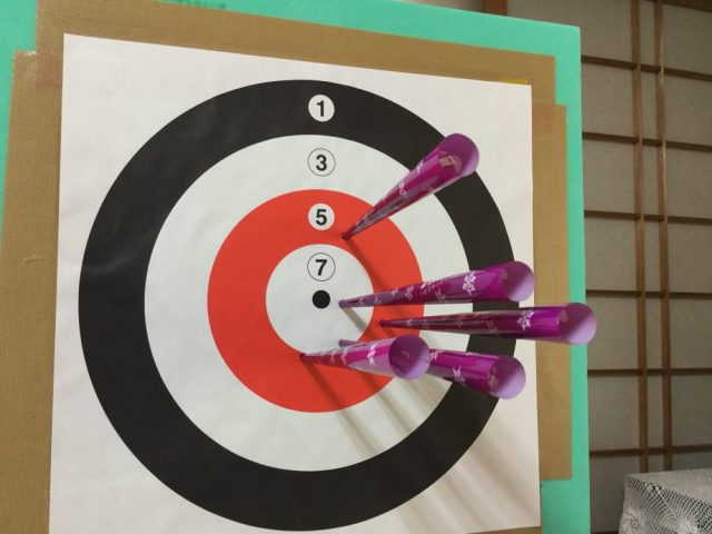 当たる、というより、食い込む感じ。乾いた音が耳と心に心地いい。中心が7点。外に向けて点数が減っていく。