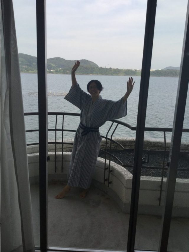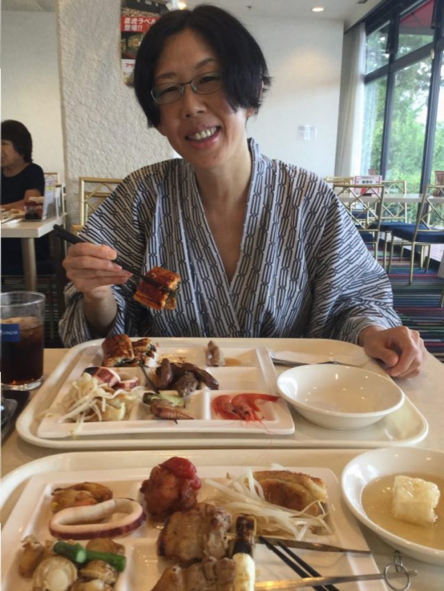 ゆったりとお風呂に入った後は、浴衣に着替えて夕食へ。バイキングなので気楽~。特筆すべきは、さすが浜名湖。「焼きたてうなぎ」がある!あぁあ、おしいー。調子に乗って食べていたら、ほとんど「うな丼」状態。せっかくのバイキングなのに。