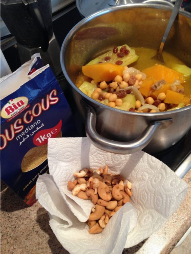 かぼちゃ、ズッキーニ、ニンジン、玉ねぎ、ひよこ豆、肉・・・と野菜いっぱいのクスクス。煮込み料理なので、見た目はごついが消化はいいのだ。甘みを出すために「干しぶどう&プルーン」も入っているし、最後に炒めたカシューナッツをばらまいて、できあがり!