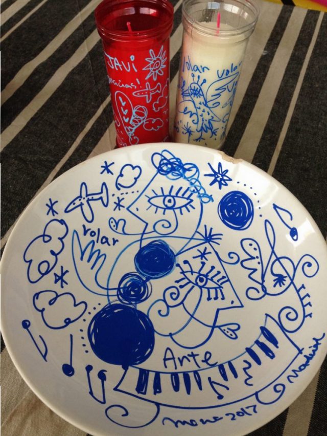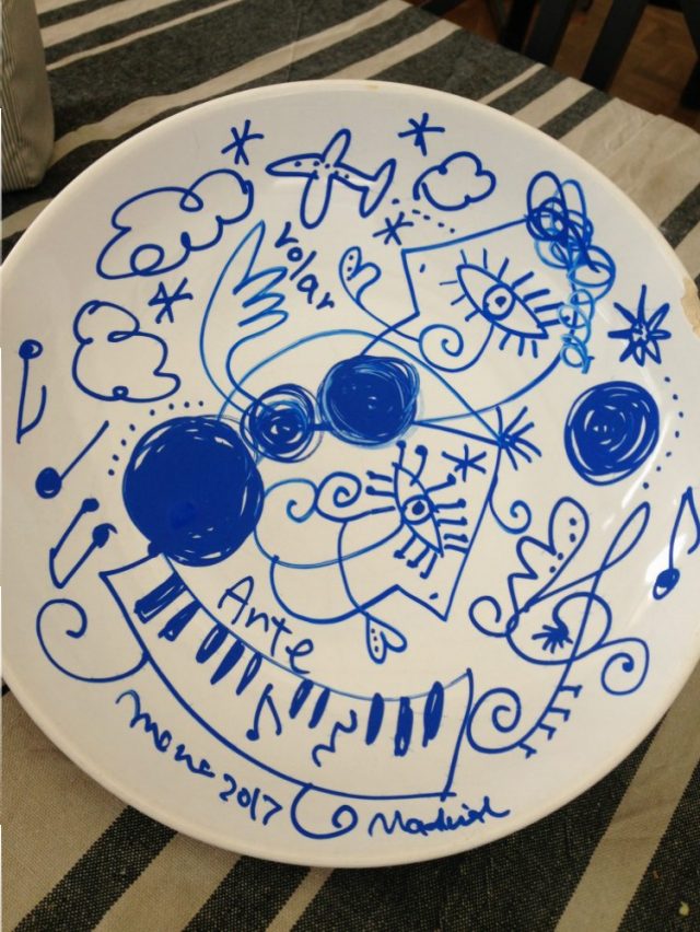 青いマーカーで一気に描く。あぁあ、気持ちいい。滑りがよくて。そりゃお皿だもんな(笑)滑る滑る。