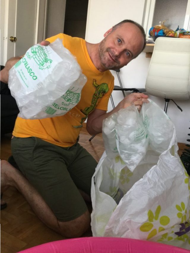 氷12袋を二人で抱えて、マンションへ。部屋に帰るなりハビ吉が
