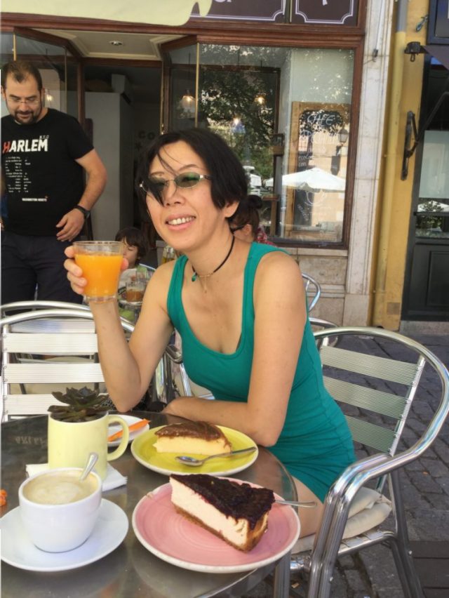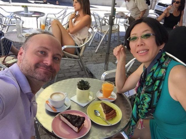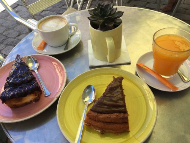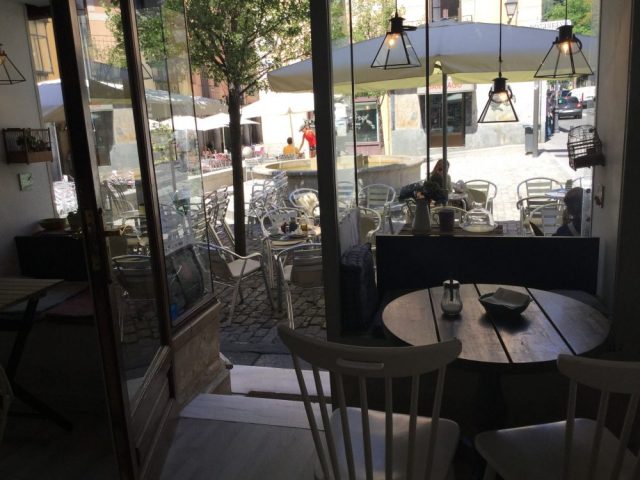 それが、けっこう大きい。チーズケーキと、ドゥルセ・デ・レチェ(四~五枚目)。お店の中にもテーブルはありますが、見事に誰もいない(笑)。スペイン人は本当に外にいるのが好き~。
