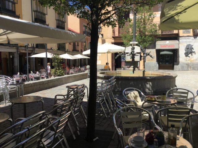 歩けば汗が出てくるが、マドリッドのセントロとちがい涼風が吹く。視界の端にいつも山があり、避暑地の風情。山裾にたたずむせいか、どこかアルプスの村っぽい。教会や噴水、広場など、村の中を一通り散策。ざっと早足で回って40分。
