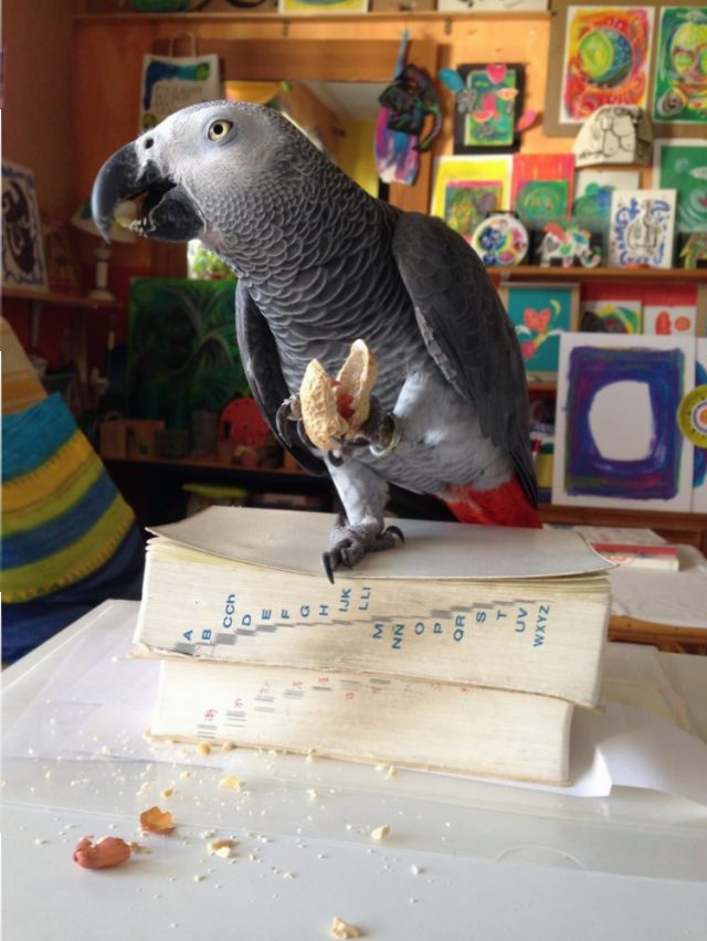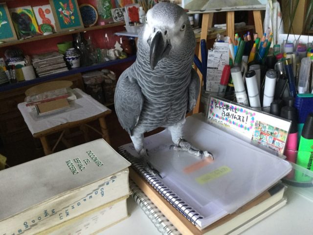そんな私の多忙状態には、まるでお構いなしのオウム。なんということか、辞書やノートを階段にして遊んでいる。そのうえ、ちょっと目を離したすきに大切な辞書の上で