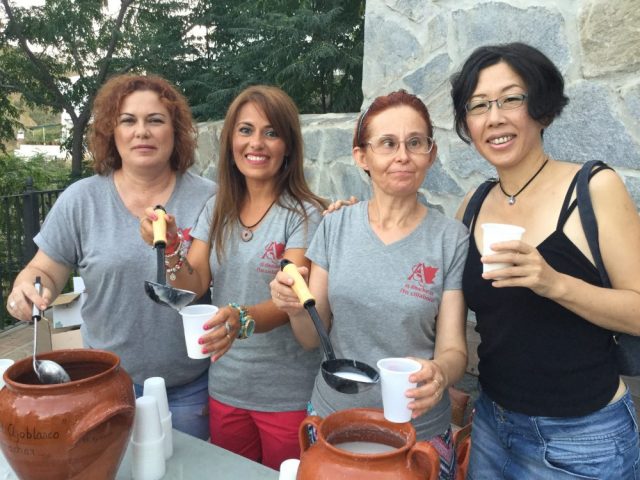 村の広場では「アホ・ブランコ」がふるまわれていました(四枚目)。アーモンドとにんにくが主食材の白いスープ。マラガのバルやレストランでも食べることができますので、ぜひお試しを。