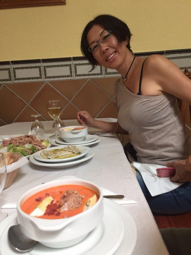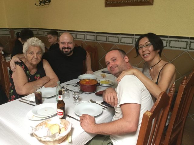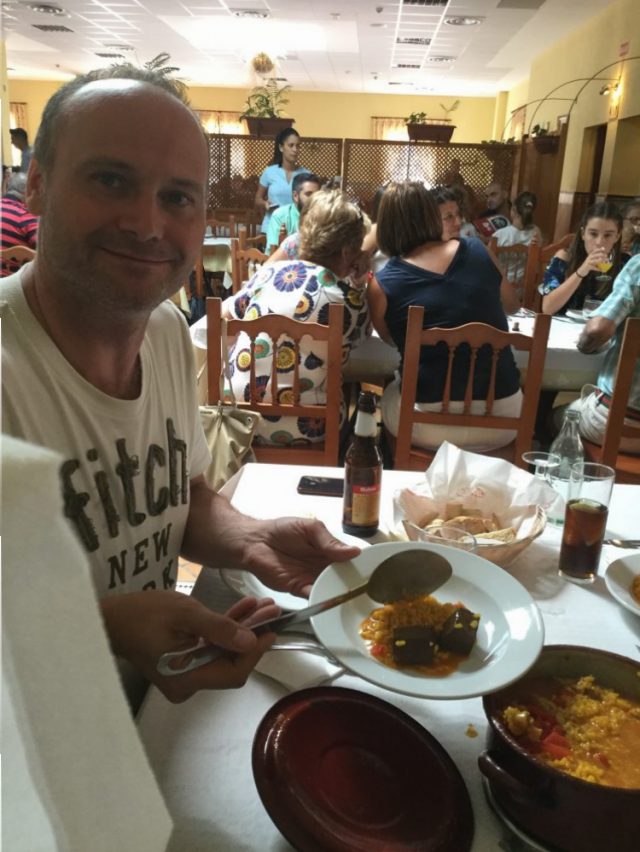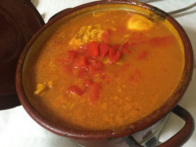 この日のメインは「アロス・カルドソ」。一言でいうならスープの多いパエジャ(写真四枚目)。こうして「鍋」のまま厨房から運ばれてきます。日本の雑炊に似ていておいしい~。熱々‘~。