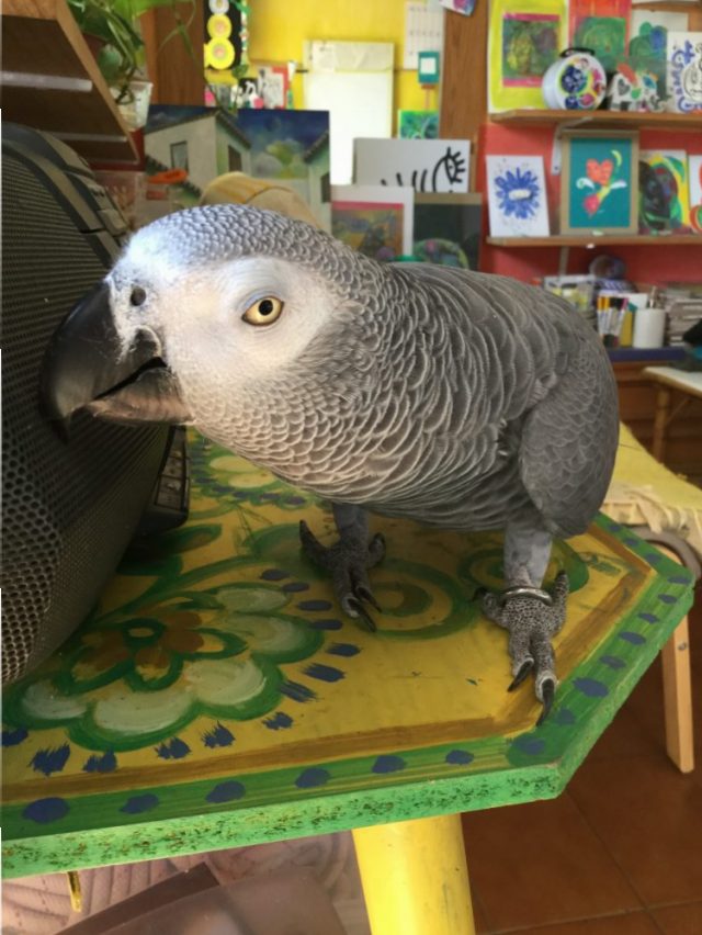 せっかくなので、音楽に吸い寄せられて飛んできたオウムを紹介します。カセットデッキにへばりついてる~(三枚目)。