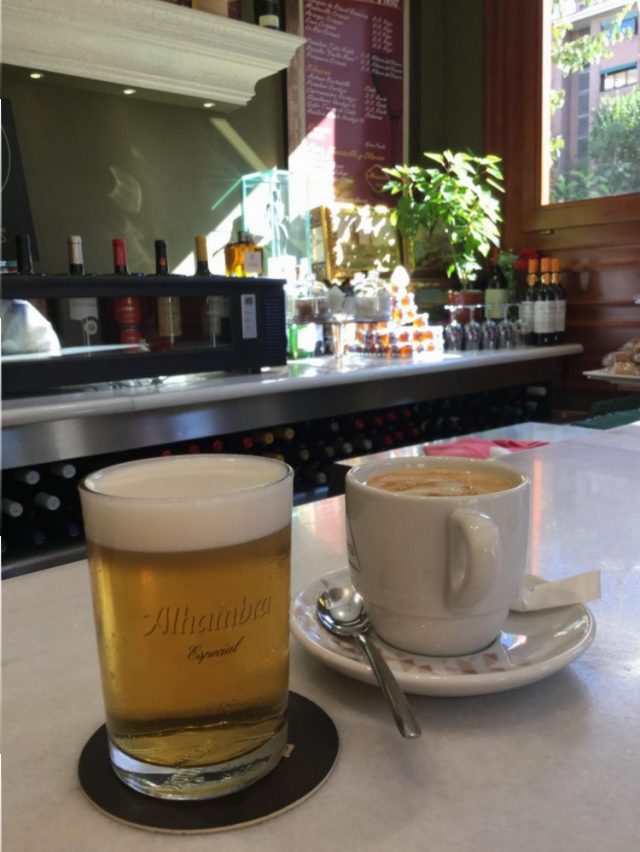 さて、マラガ九時発。温かいコーヒーを駅でテイクアウトし、列車に乗り込む。自前のサンドイッチで朝食。お昼前にマドリッドのアトーチャ駅でハビ吉と合流。さっそくバルへ(写真二枚目)。コーヒーとビールが並んでますが、どっちが誰のでしょう(三枚目)。今頃、朝食?
