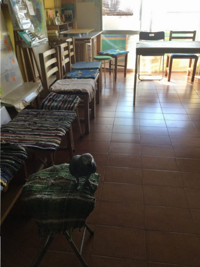 ついでに床をモップがけ。忙しく動き回っていたら、興味を惹かれたオウムがさっそくやってきた(一、四枚目)。