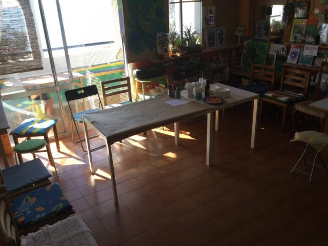 なにしろ重いソファもテレビもないし。テーブルや画材カートを移動すればいきなり、ドカーンと現れるスペース。あぁあ。思い切って物を捨ててよかった。