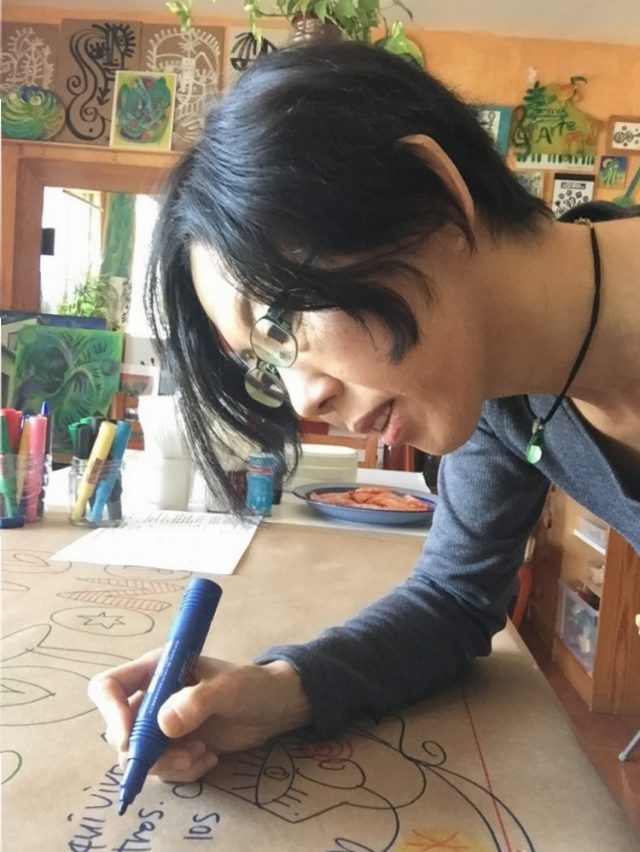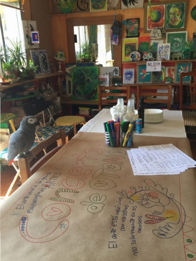 これ、実は「カートン紙」。みなさんをお迎えするためのメッセージを書きこんでいるところ(二枚目)。使い捨て。一回限り。一期一会。