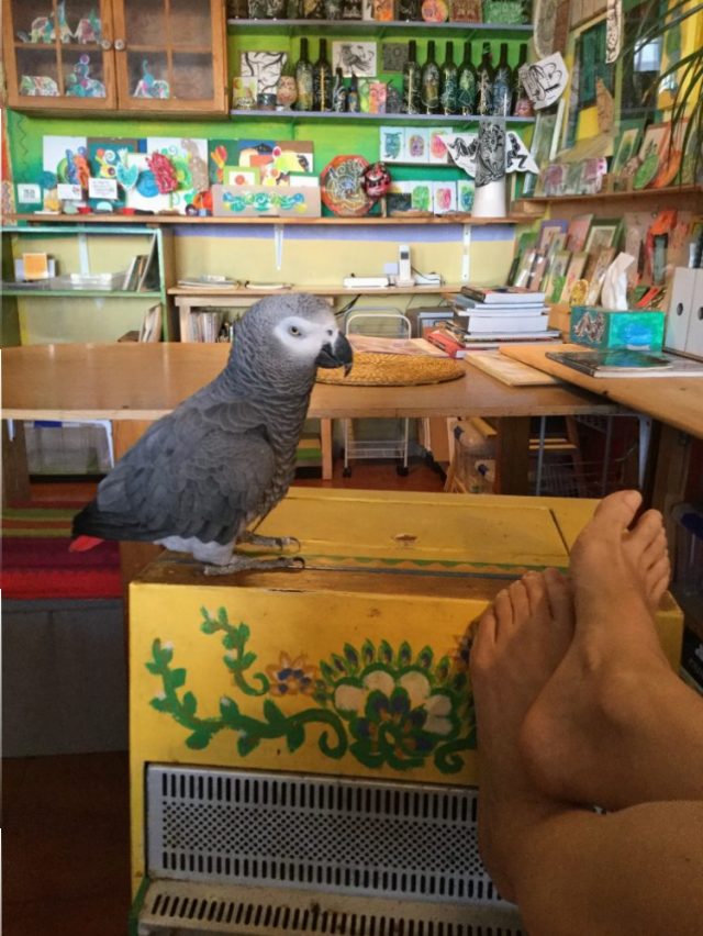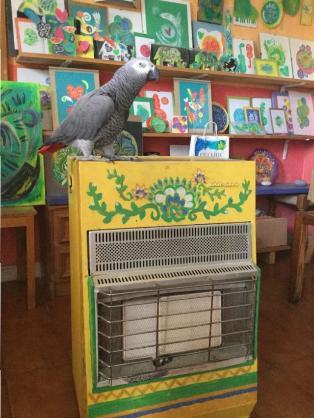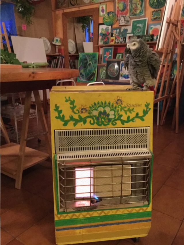ハンガリー風にペイントされ、冬以外は「物置き台」として一年中活躍。この上でオウムは暖を取り、私はよく足を温めていたなぁ(写真)。懐かしー。思い出がいっぱい~。