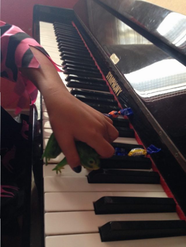 一本指はもちろん(写真一枚目)、カエルで弾くのもあり!(二枚目)。カエルが飛ぶたび音が出るのが、楽しいらしい(笑)。