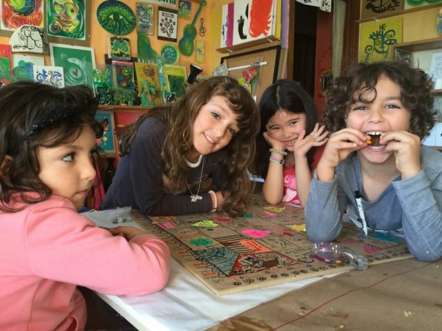 さらに「ちびっ子アート教室」の子供たちは、毎週描いた絵や工作を壁一面にディスプレイ。これも前日までかけて、みんなでテープや画鋲で美しく飾りつけ。