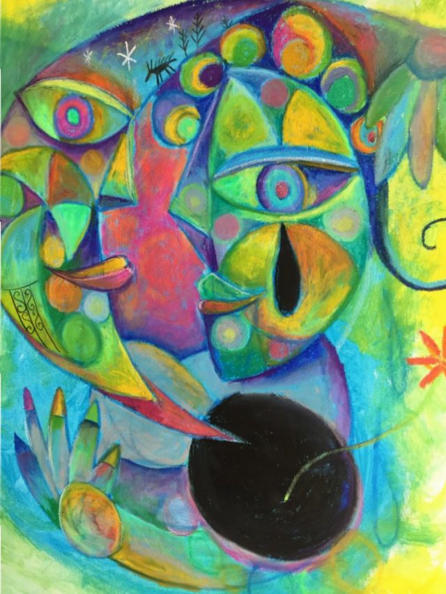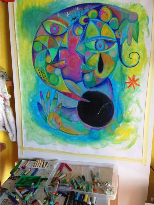 この作品、実はまだ描きかけ。なのに、アップしてしまうという(笑)。キャンバス地にアクリル絵の具、そしてオイルパステルで描いています。