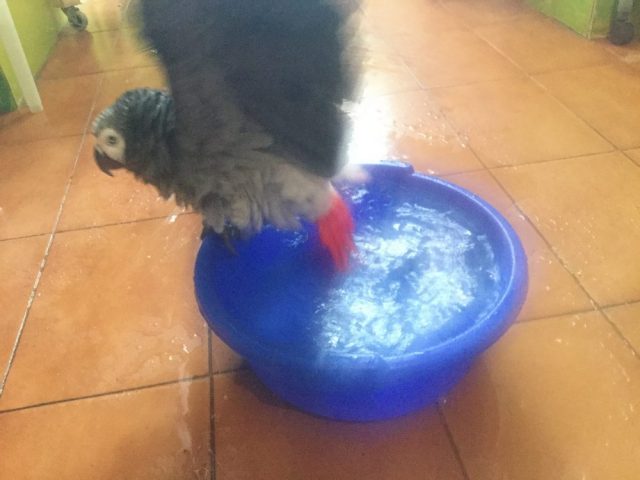 それにしても、やる気満々。ものすごい勢いで洗面器に突っ込み、全力で羽ばたきをくり返す。