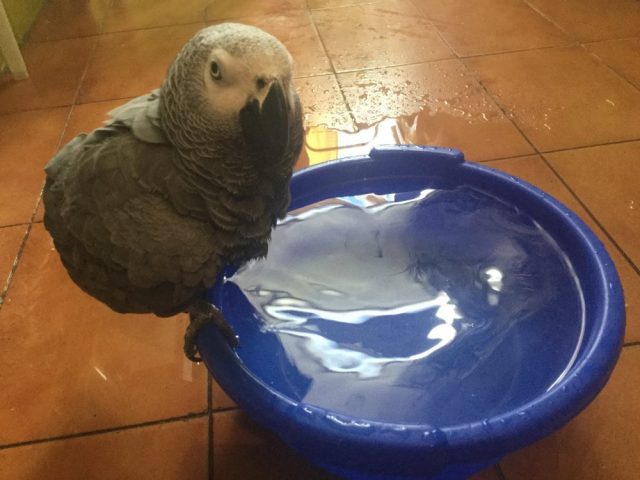 で、急いで水浴び会場を設置。台所の床に水を張った「洗面器」を置く。これまで一回り大きいタライ風のがあったんだけど、壊れてそのまま。