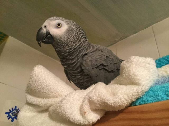 棚の上から私を見下ろしているオウム(写真)。新しいタオルを巣の代わりにして。