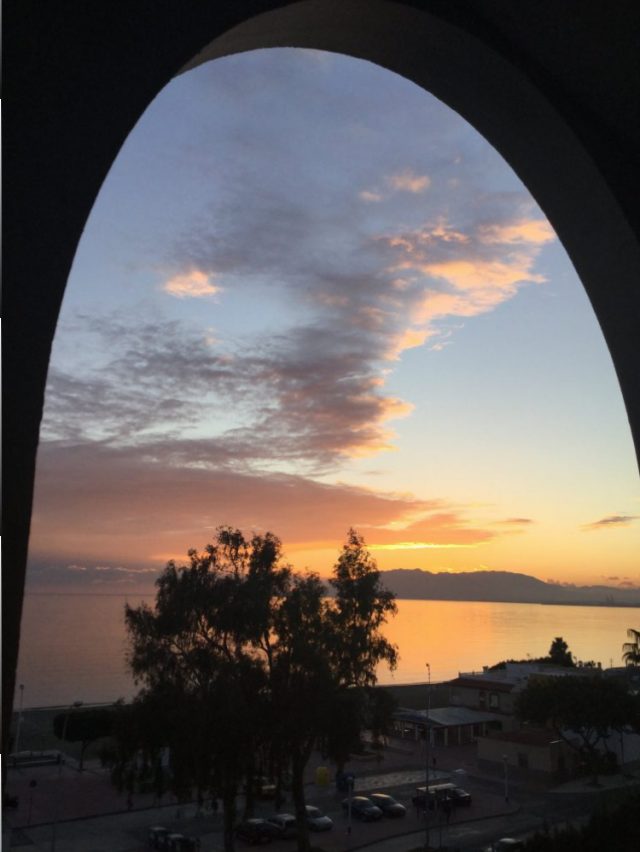 冬のマラガは夕焼けが美しい。波のない穏やかな地中海は、鏡のように空の色を映し出す。