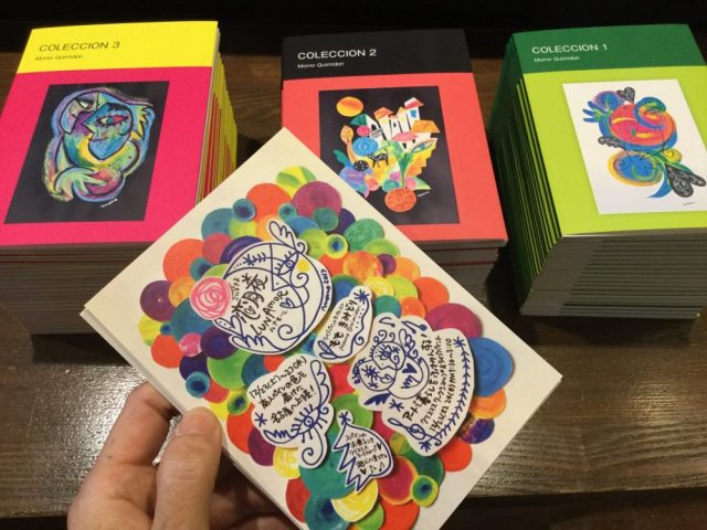そして!クロ隊長と二人三脚で作り上げた、涙と汗の作品カタログ「Momo Quimidor COLLECCION」も完成。どうにか間に合いました(涙)。刷りたて三セットがテーブルに並ぶ。やったー。