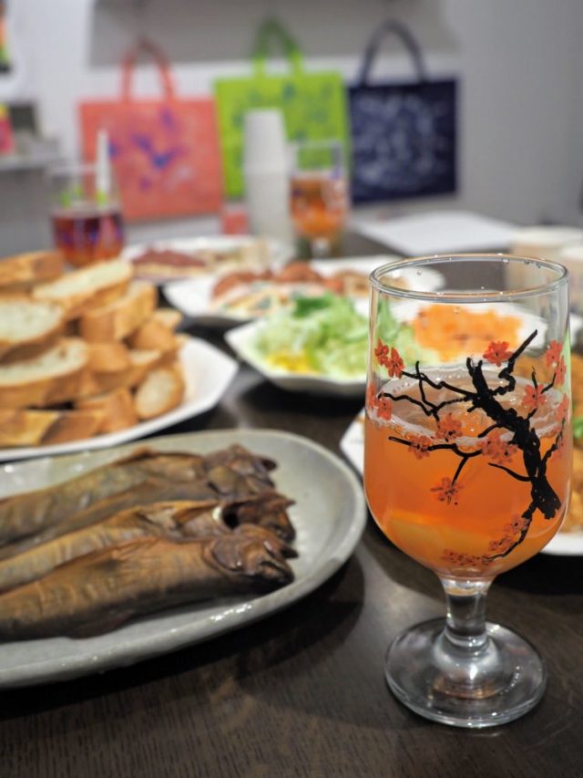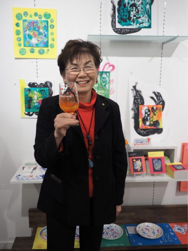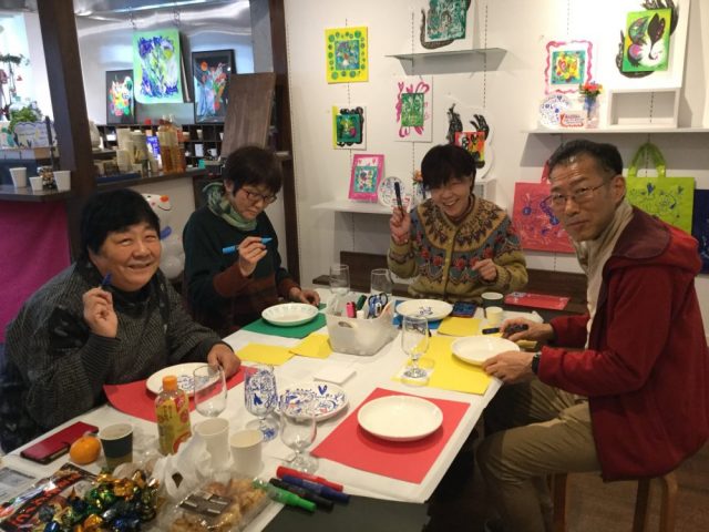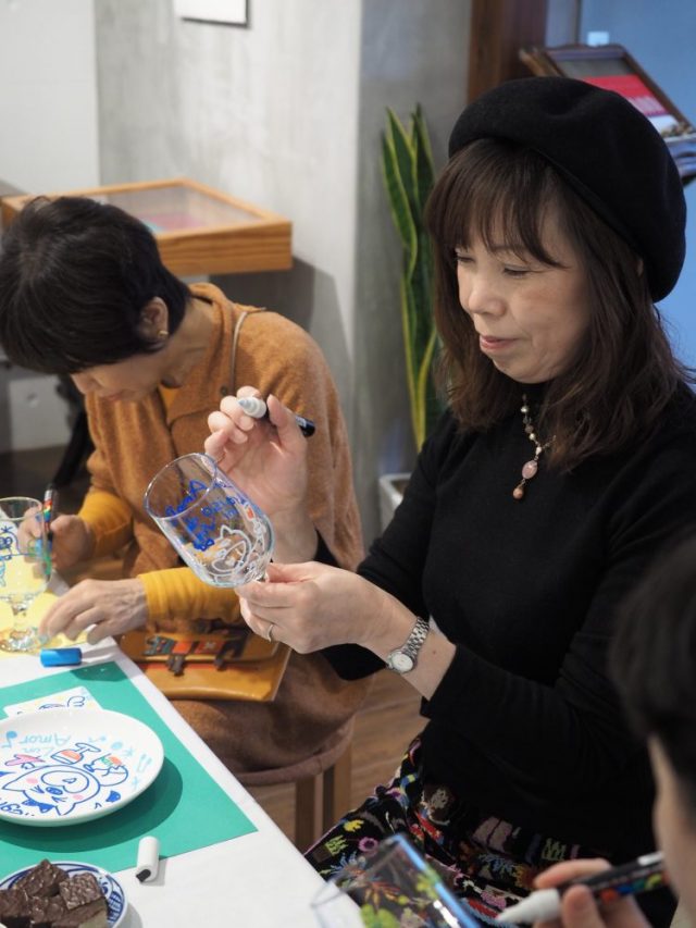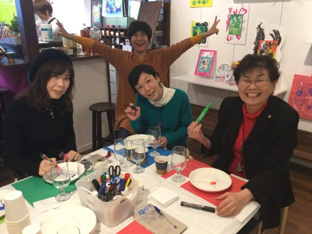 ペイントしたばかりのグラスで乾杯!みなさん本当にお上手で、それぞれ個性ある、すてきなスタイルの作品が続々と生まれました。