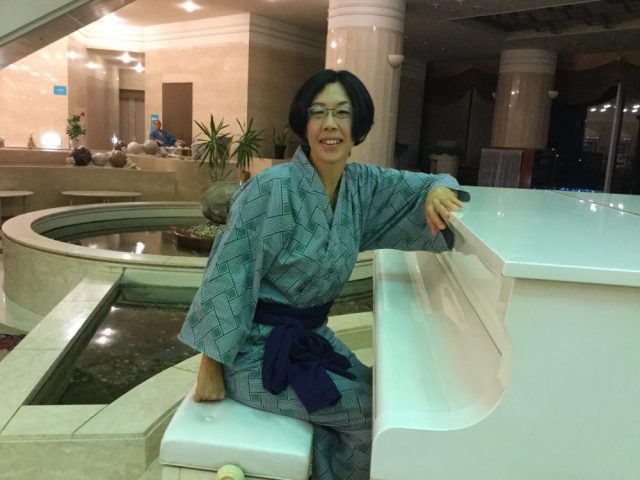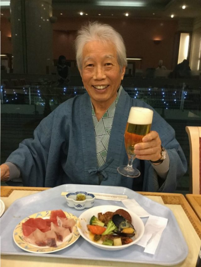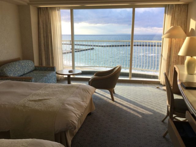 さて、海を眺めながらお湯につかり至福の時。なんと打たせ湯まである。すっかり上機嫌で部屋へ。もちろん浴衣に変身。やっぱ日本はいいなぁ。