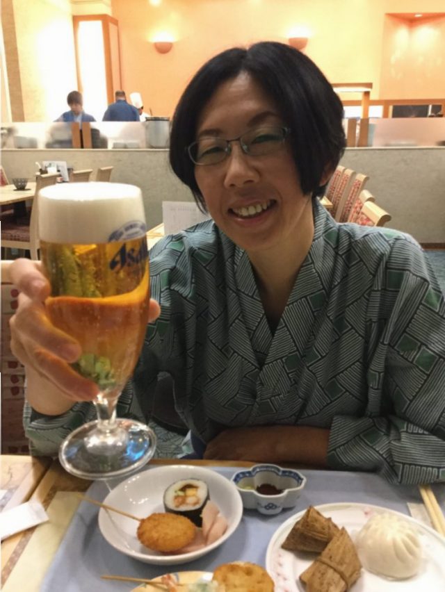 夕食はバイキング。好きなものを食べられるのが楽しい~。前は四人がけのテーブルに四人。それが二人になると、急にすっきりして感じられる。