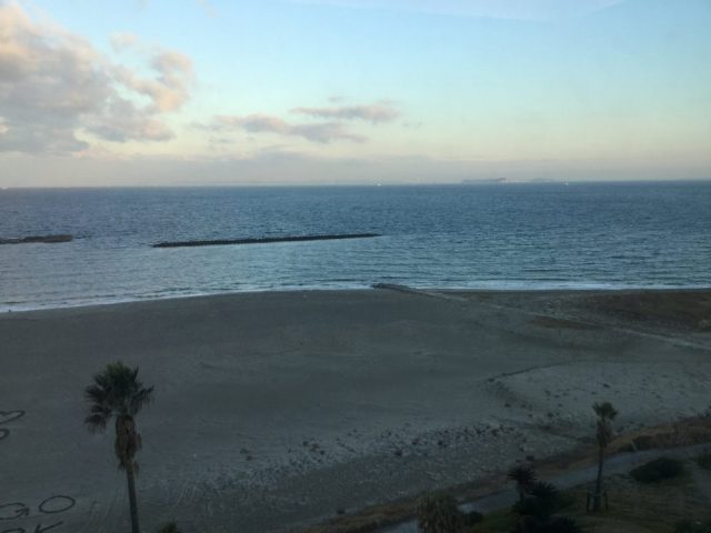 さて、さっそく大浴場へ。これがまたすばらしい眺め。女湯の入口から撮影(四枚目)。ヤシの樹まで生えていてちょっと。地中海行かなくても、伊良湖でいいじゃん(笑)。ねぇ。