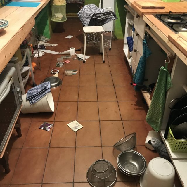 まずは、意気揚々のオウムをよーく叱って鳥かごの中へ。それから改めて床にしゃがみ込み、ザル、ゴミ箱、瓶、布巾、食料品、包丁などを一つ一つ拾い上げていく。
