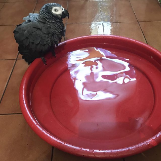 さて、この春からオウムの「水浴び用桶」が大きくなりました(二枚目)。慣れない容器なので、中に入ってくれるのに10分ほどかかりましたが、どうやらお気に入りの様子。やれやれ。