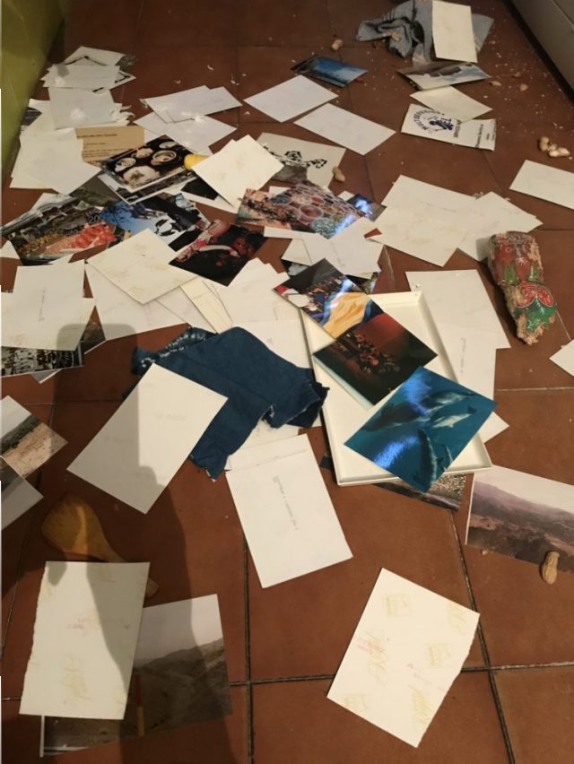 台所に入ったとたん、この光景が(呆然)。ま、写真の山を台所に置いておいた私も悪いのですが。まさか、写真の山を襲うなんて。