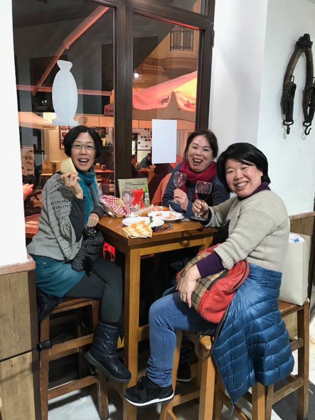さて、この日は「女子会&送別会」ということで、マラガのセントロに集合。あいにく雨が降っていて寒いのなんの~。たえちゃん(向かって右)も、雨の中かけつけてくれてありがとう。
