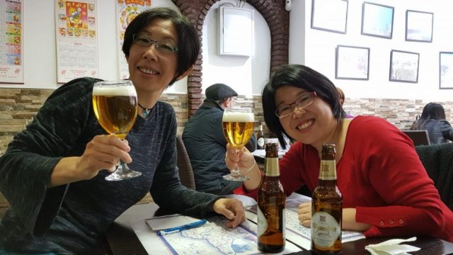 頭を使ったので、すっかり酔いが覚めてしまいビールをおかわり。再びおしゃべりに突入。なぜか日本の「会社員時代」の話になり、たえちゃんがいきなり
