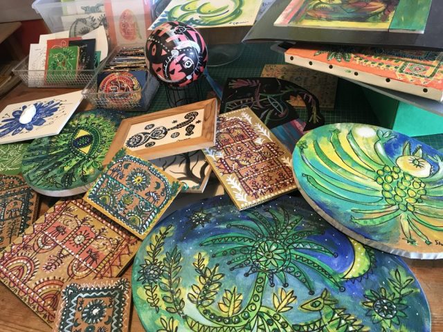 翌朝、起き出して呆然。テーブルは絵の山。床も作品で埋めつくされている。