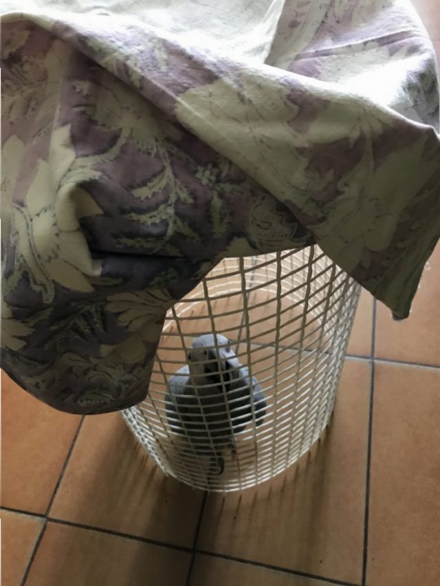 これでオウムを上から狙い、すとんと中に閉じ込めて布でふた。意外に便利だったのは、どこでも狙い撃ちでき、簡単にオウムがしとめられるところ。