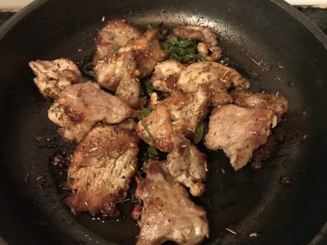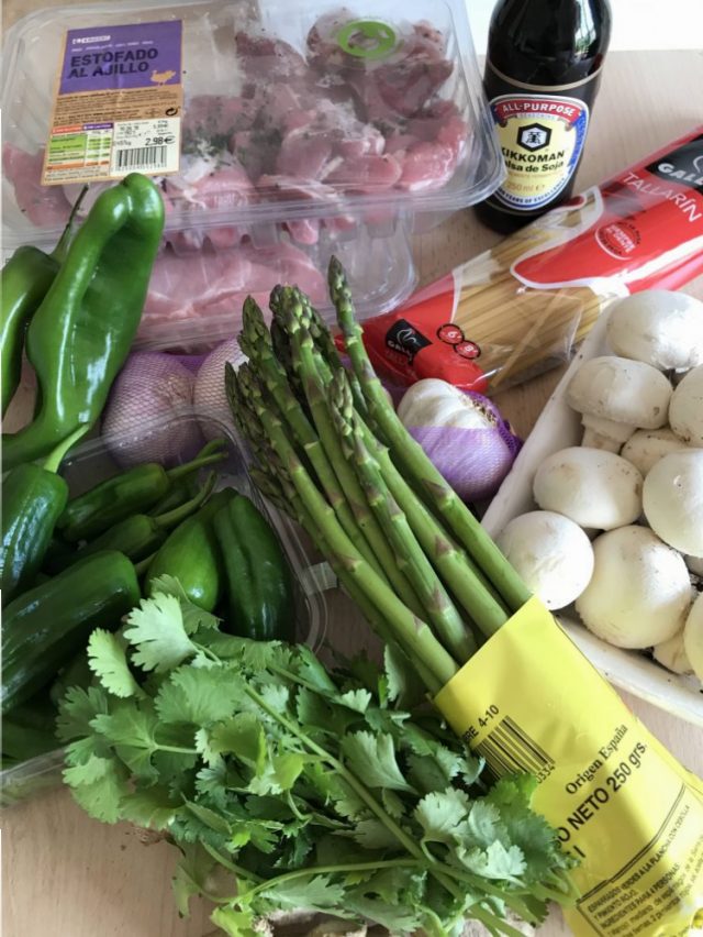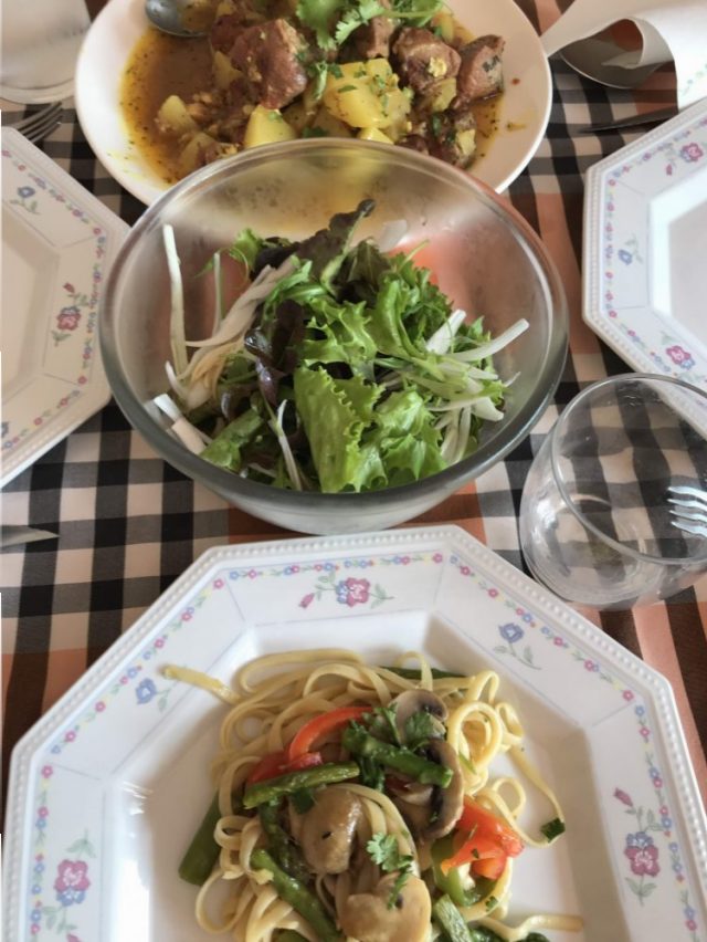 「野菜スープ、豚肉の煮込み、アスパラとマッシュルームのパスタ、サラダ、豚肉のソテー」
