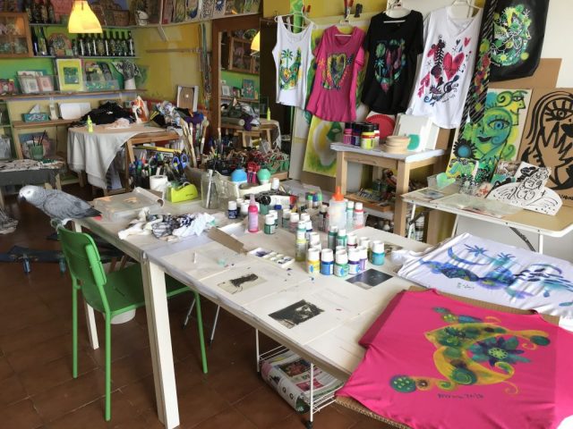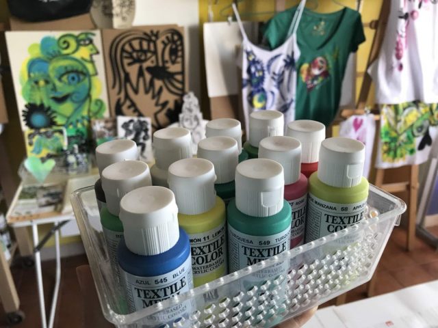 で、今うちのアトリエは「服屋」と化している。テーブルというテーブル、床も使ってペイント中。