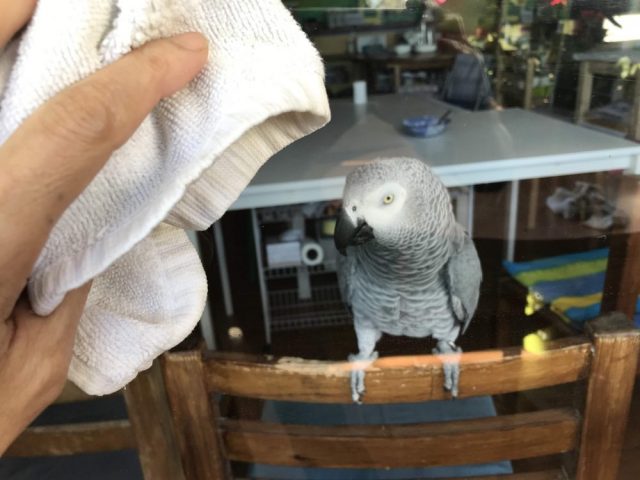 窓をふけば、近くのイスにやって来て一緒に頭を動かす(二枚目)。